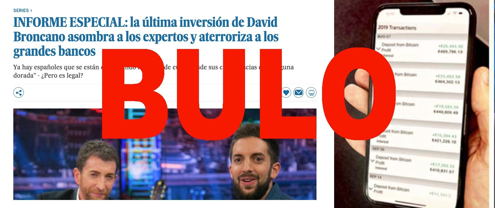 Ya os hemos hablado en varias ocasiones de un timo que usa caras conocidas para quedarse con tu dinero con falsas inversiones en bitcoin. Ahora usa a David Broncano para intentar colárnosla afirmando que el comediante ha hablado en televisión sobre una supuesta inversión en Bitcoin Evolution con la que se ha hecho rico. Es un timo.