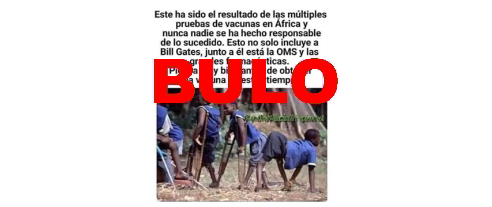 Desde hace unos días nos habéis preguntado a través de nuestro servicio de WhatsApp (644 229 319) por una imagen en la que se ven a niños con deformaciones en el cuerpo que supuestamente habrían sido "el resultado de las múltiples pruebas de vacunas en África" llevadas a cabo por Bill Gates, la Organización Mundial de la Salud (OMS) y las grandes farmacéuticas. Es un bulo: la foto forma parte de una campaña de la OMS para la erradicación de la polio y muestra a niños que padecen dicha enfermedad.