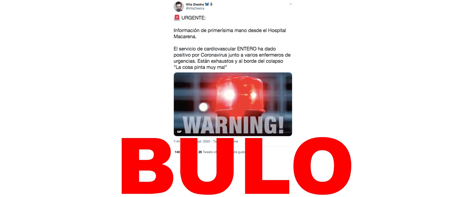 Se ha difundido en Twitter una publicación en la que se afirma que en el Hospital Virgen Macarena de Sevilla "el servicio de cardiovascular ENTERO ha dado positivo por Coronavirus junto a varios enfermeros de urgencias". Es un bulo, la Junta de Andalucía lo niega y también un profesional de esta unidad. Además, desde el Hospital Virgen Macarena nos remiten al comunicado de la Junta.