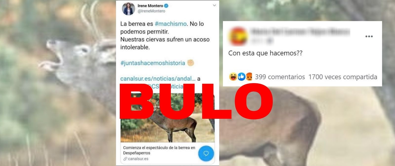 Circula una captura de un supuesto tuit de la ministra de Igualdad, Irene Montero, en el que habría escrito que la berrea, la época de celo del ciervo que se da al comienzo del otoño, "es machismo". El texto continúa diciendo que "no lo podemos permitir. Nuestras ciervas sufren un acoso intolerable". Es un bulo. El supuesto tuit no está publicado ni lo hemos encontrado archivado ni en la caché de Google. Además, lo que circula es una única captura sin fecha de publicación y desde el Ministerio de Igualdad nos aseguran que es "falso".