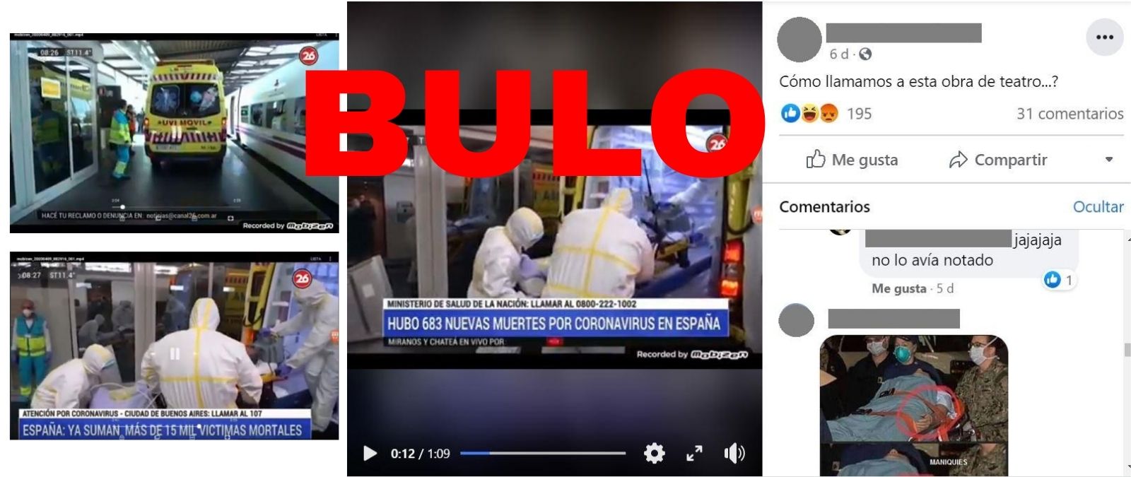 Está circulando un vídeo en Facebook, que también está en YouTube, y que utiliza imágenes del Canal 26 de la televisión argentina en las que se ve cómo dos sanitarios bajan de una ambulancia supuestamente a un paciente con coronavirus que resulta ser un maniquí. Mientras aparecen esas imágenes, una persona va parando el vídeo y comentando que intentan ocultar el "muñeco" para que los espectadores no lo puedan ver y hacerlo pasar por un contagiado de verdad. Es un bulo. Se trata de una simulación realizada en la estación de Atocha, en Madrid, cuando Renfe terminó de medicalizar tres trenes por si hacían falta para trasladar a enfermos de COVID-19 a otras zonas del país. Además, los medios no ocultaron que se tratase de una simulación.