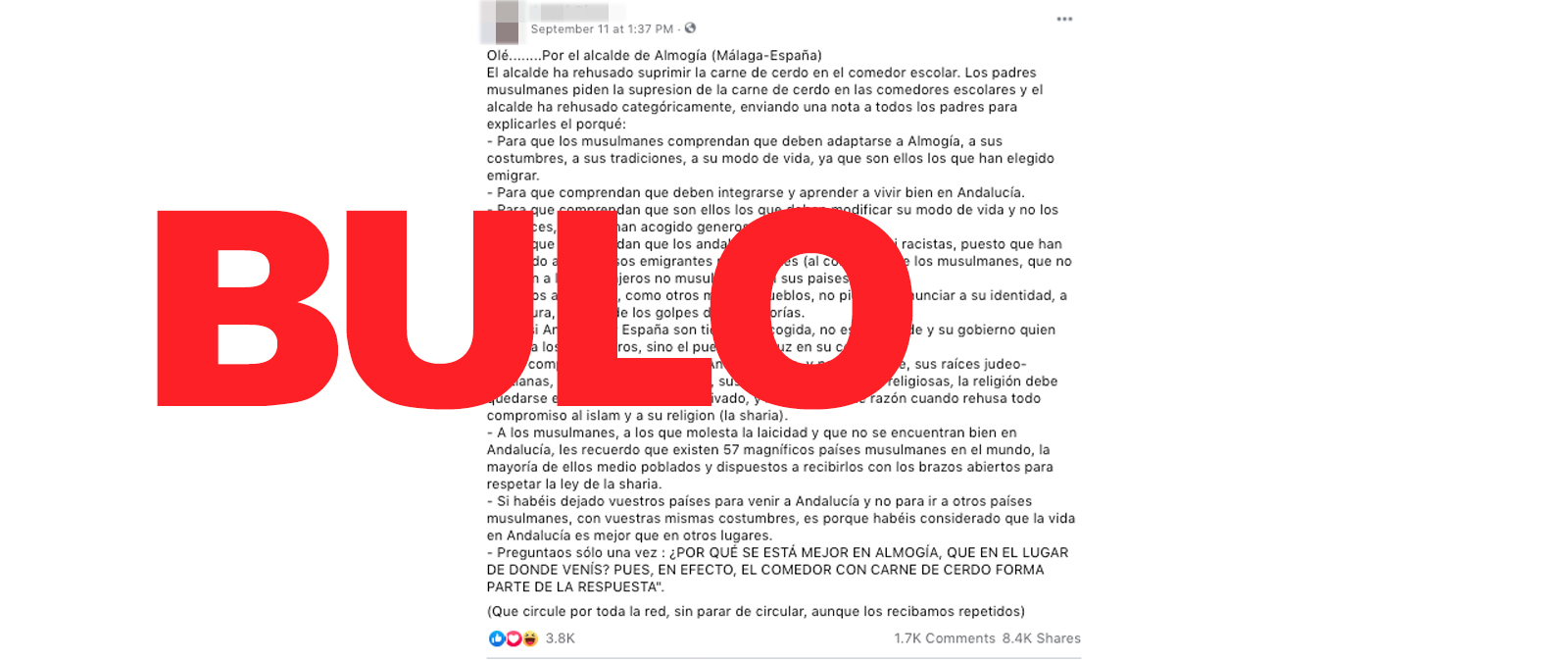 En el mensaje que se difunde se dice que "los padres musulmanes piden la supresión de la carne de cerdo en los comedores escolares". Este mensaje empieza diciendo "ole por el alcalde de Almogía (Málaga-España)" y sigue afirmando que "el alcalde de Almogía ha rehusado suprimir la carne de cerdo en el comedor escolar". Desde el Ayuntamiento aseguran que "es un bulo" y que no se ha recibido ninguna queja. Además, añaden que "el alcalde jamás haría estas declaraciones".