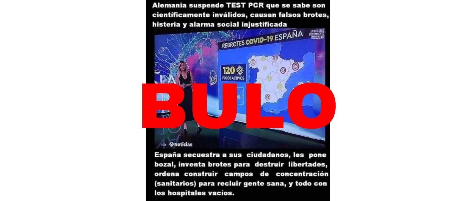 El texto completo dice: "Alemania suspende TEST PCR que se sabe son científicamente inválidos, causan falsos brotes, histeria y alarma social injustificada. España secuestra a sus ciudadanos, les pone bozal, inventa brotes para destruir libertades, ordena construir campos de concentración (sanitarios) para recluir gente sana, y todo con los hospitales vacíos". El texto se acompaña de una imagen de un informativo de la cadena de televisión Antena 3, con un mapa de España en el que se marcan algunos de los focos de COVID-19 activos en ese momento en el país.