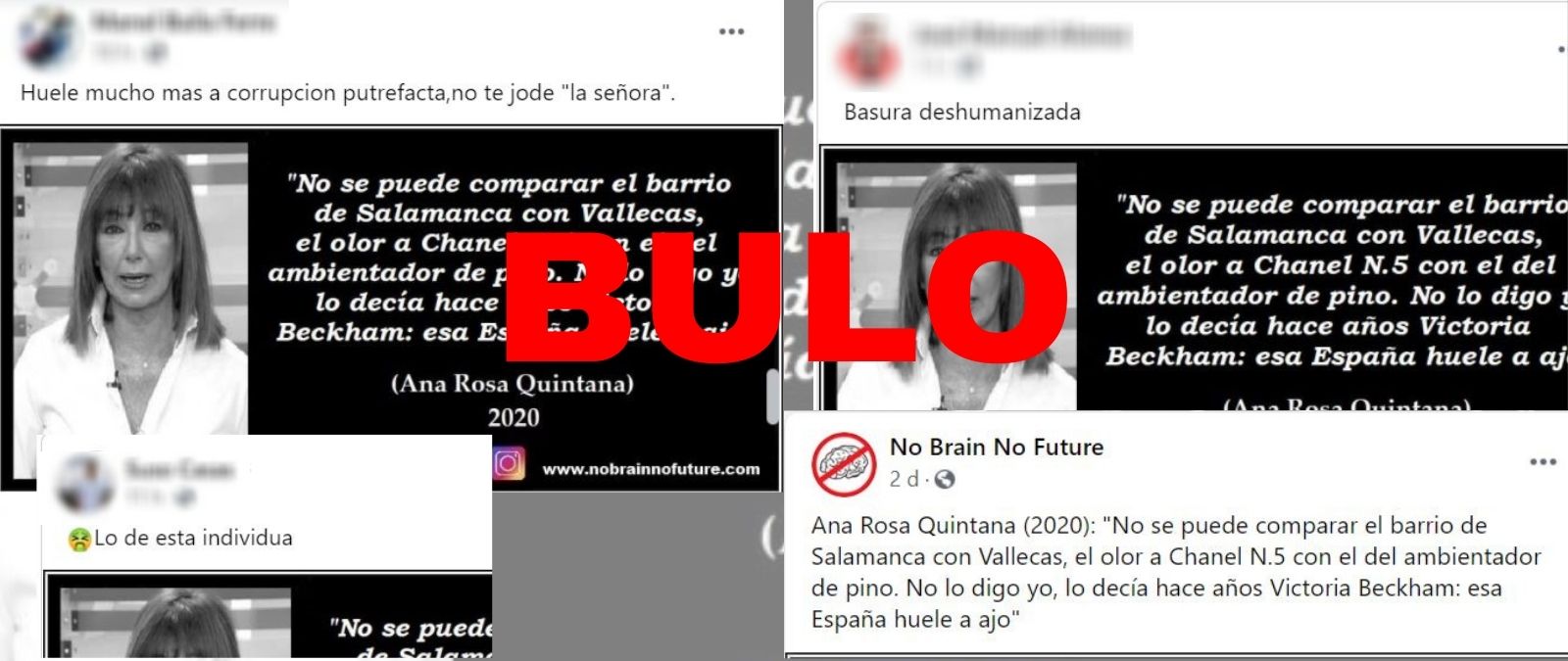 Está circulando en Facebook y en Twitter un contenido por el que también nos habéis preguntado a través de nuestro chatbot de WhatsApp (644 229 319). Es una frase atribuida a Ana Rosa Quintana que dice que "No se puede comparar el barrio de Salamanca con Vallecas, el olor a Chanel N.5 con el del ambientador de pino. No lo digo yo, lo decía hace años Victoria Beckham: esa España huele a ajo". Es un bulo. Se trata de un contenido publicado la primera vez por una cuenta que se autodefine como "una página de humor" y que ahora se comparte como real.