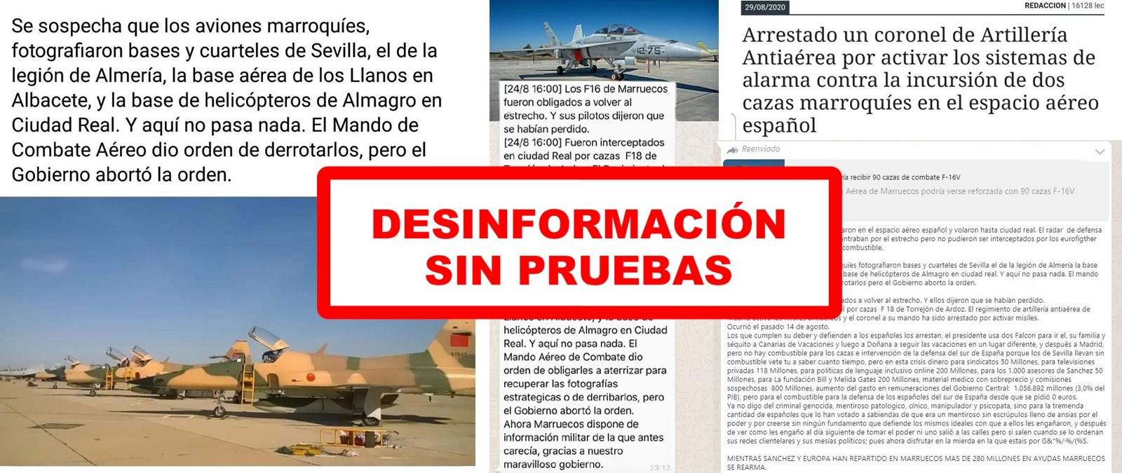 Este contenido citaba como fuente a Defense Arab, medio especializado en información militar, que tuiteó el 12 de agosto que dos cazas marroquíes habían entrado en el espacio aéreo español. Un día antes, el 11 de agosto, The Political Room, medio especializado en política internacional, había publicado el contenido su web.