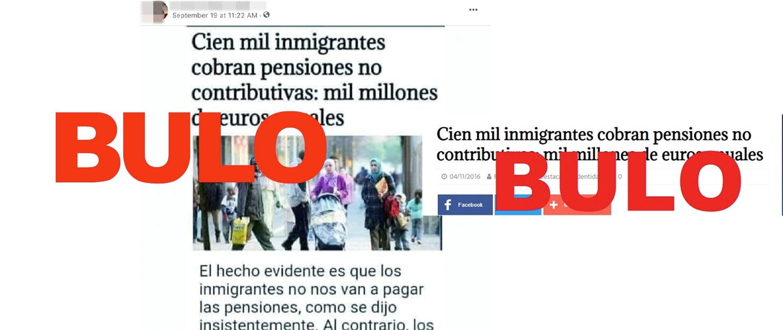 Se está difundiendo una imagen que afirma que “cien mil inmigrantes cobran pensiones no contributivas”. También se ha difundido un mensaje que dice que "pagamos pensiones a más de 100.000 inmigrantes que jamás cotizaron nada" [sic]. Esta afirmación se lleva difundiendo desde al menos 2016, con publicaciones como la de la web Rambla Libre. Era un bulo entonces y también lo es ahora.