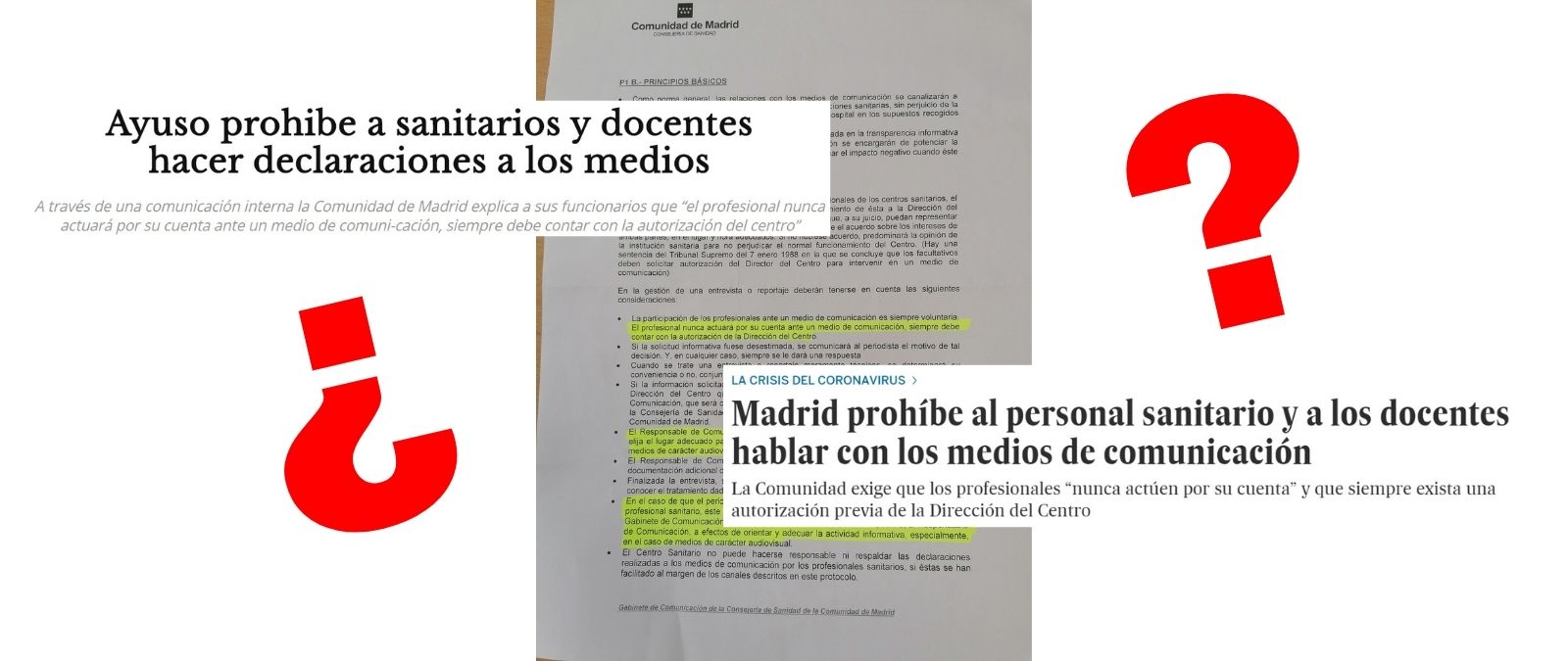 Después de la publicación de José Ángel Satué, Diario 16 publicó un contenido titulado "Ayuso prohibe a sanitarios y docentes hacer declaraciones a los medios"[sic]. El País tituló "Madrid prohíbe al personal sanitario y a los docentes hablar con los medios de comunicación".