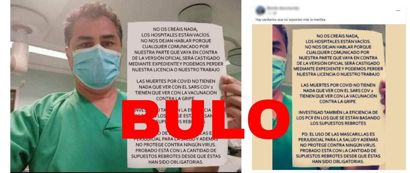 Circula en redes sociales la foto de un sanitario con un cartel en la mano que comienza diciendo que los hospitales están vacíos. Continúa afirmando que las muertes por COVID-19 están relacionadas con la vacuna contra la gripe. Además, carga contra la eficiencia de las pruebas PCR y asegura que el uso de mascarillas es perjudicial para la salud. Es un bulo. El cartel está manipulado. Además, no hay evidencias que relacionen el SARS-CoV-2 con la vacunación de la gripe, las PCR sí son útiles para detectar a personas infectadas y tampoco hay evidencias de que las mascarillas sean perjudiciales para la salud. Os lo contamos.