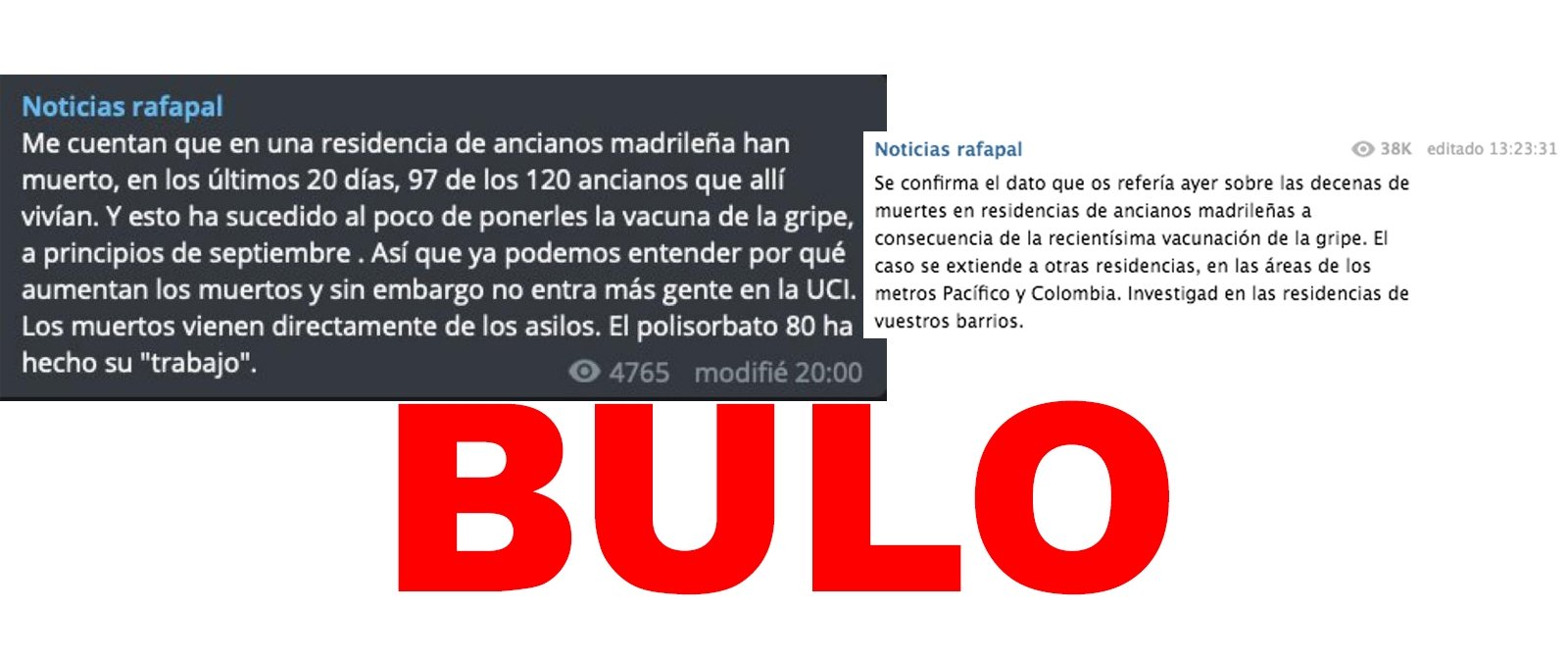 El mensaje que circula relaciona supuestos fallecimientos en una residencia de mayores con la vacuna de la gripe. "Esto ha sucedido al poco de ponerles la vacuna de la gripe, a principios de septiembre. Así que ya podemos entender por qué aumentan los muertos y sin embargo no entra más gente en la UCI. Los muertos vienen directamente de los asilos. El polisorbato 80 ha hecho su 'trabajo'", señala el texto. En un mensaje posterior, que se difundió el 30 de septiembre, se afirma que "el caso se extiende a otras residencias" que se encuentran cerca de las paradas de metro Pacífico y Colombia.