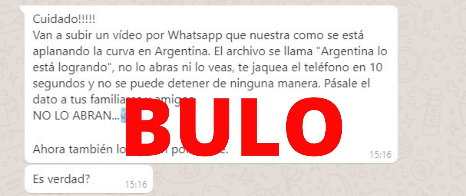 Van a subir un vídeo por Whatsapp que nuestra como se está aplanando la curva en Argentina. El archivo se llama "Argentina lo está logrando", no lo abras ni lo veas, te jaquea el teléfono en 10 segundos y no se puede detener de ninguna manera. Pásale el dato a tus familiares y amigos.