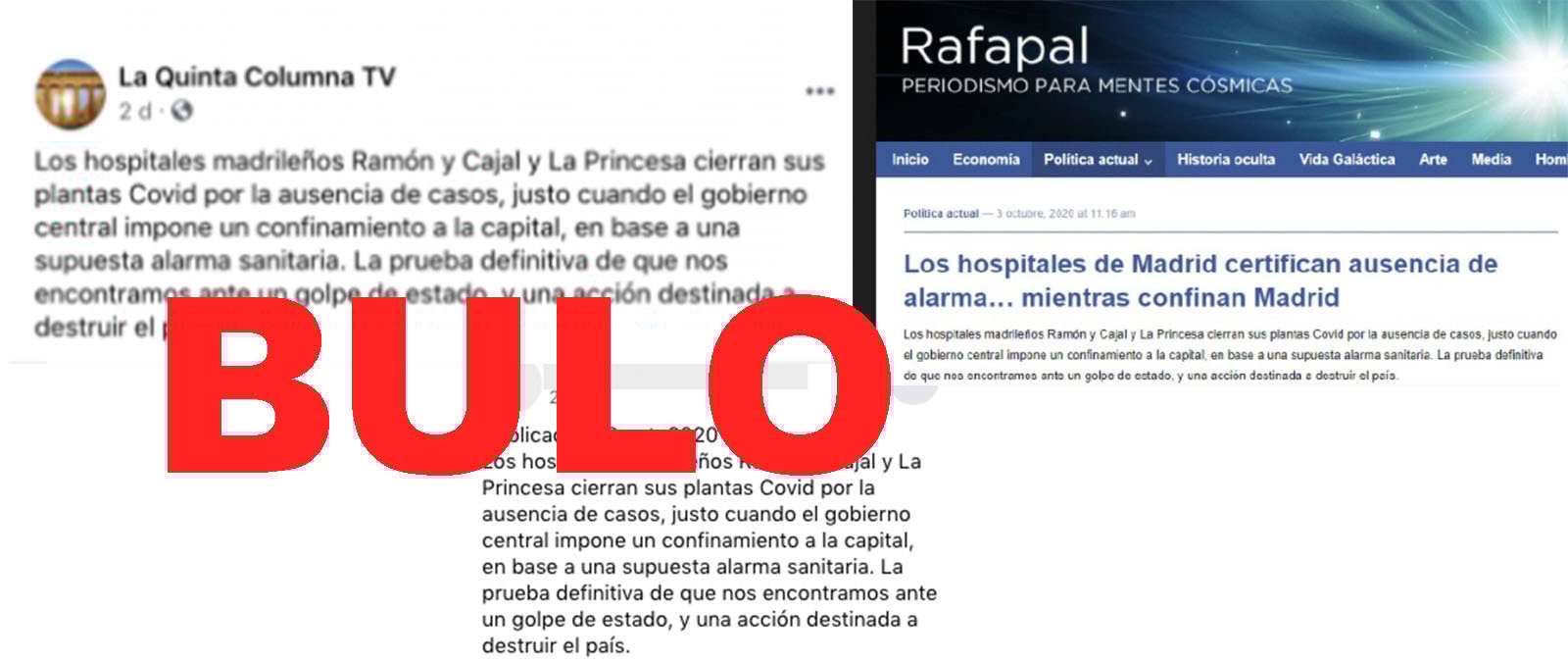 Están circulando en redes unas desinformaciones en las que se asegura que los hospitales madrileños de La Princesa y Ramón y Cajal han cerrado sus plantas covid por ausencia de casos, justo después de que el ministro de Sanidad, Salvador Illa, ejecutara una orden ministerial para el confinamiento de la ciudad de Madrid y de aquellas localidades con una población superior a los 100.000 habitantes que superen una incidencia acumulada de más de 500 casos positivos de COVID-19 en 14 días, que tengan un 35% de ocupación de camas UCI y una tasa de positividad por encima del 10%. Es un bulo.