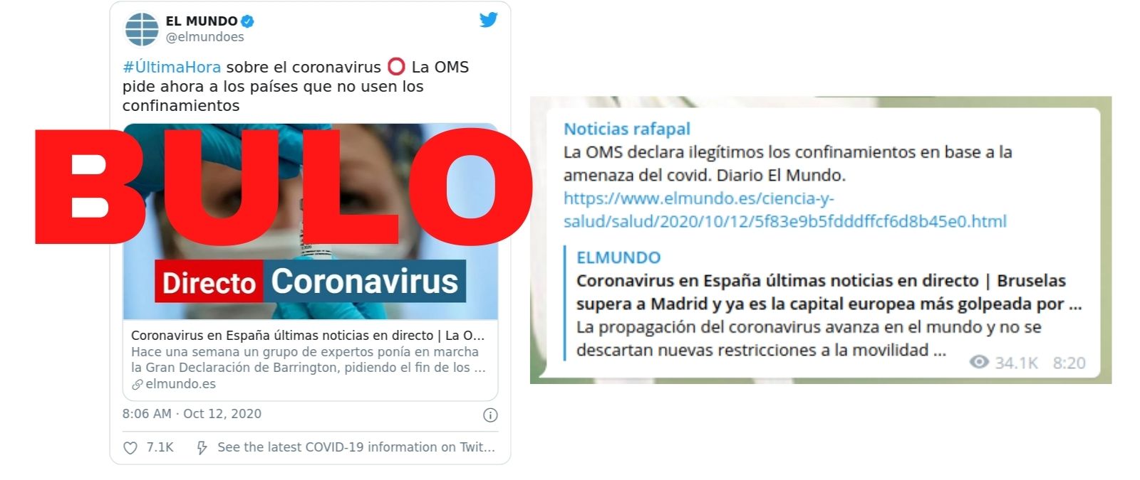 El diario El Mundo publicó el 12 de octubre que "la OMS pide ahora a los países que no usen los confinamientos". El negacionista de la COVID-19 Rafapal replicó este contenido en su canal de Telegram y su página de Facebook diciendo que "La OMS declara ilegítimos los confinamientos en base a la amenaza del covid". Es un bulo: la OMS no ha considerado los confinamientos ilegítimos ni nunca ha pedido que los confinamientos nacionales sean la medida principal para controlar el virus sino que ha apuntado siempre a la búsqueda de casos, aislamiento y las pruebas, entre otras actuaciones como las principales medidas contra la COVID-19. No obstante, la OMS incluye los confinamientos entre las medidas a tomar en ciertas circunstancias para ganar tiempo. No ha habido ningún cambio en la postura de la OMS sobre los confinamientos.