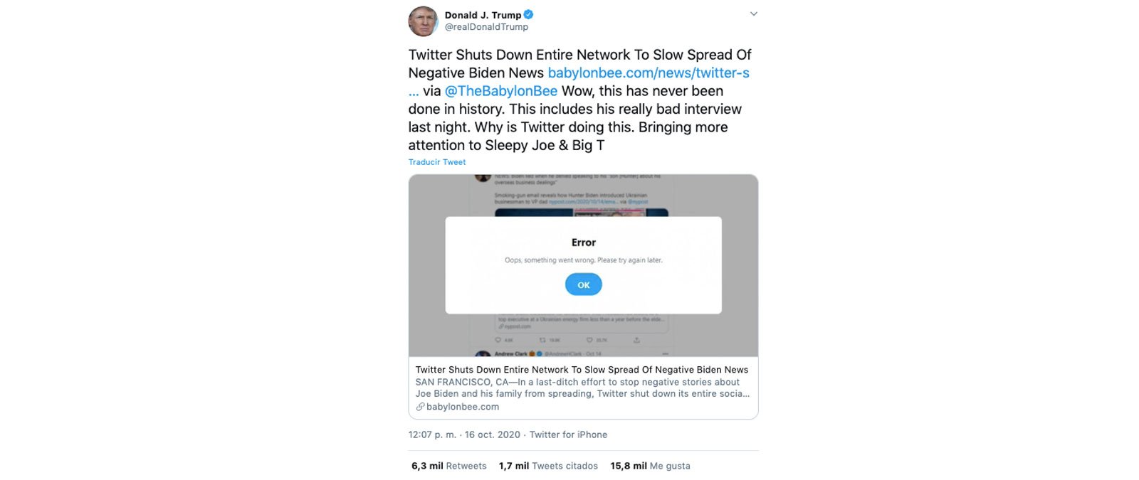 El presidente de los Estados Unidos, Donald Trump, ha difundido como real un contenido de la web satírica The Babylon Bee que asegura que Twitter dejó de estar disponible este 15 de octubre de forma intencionada "para ralentizar la difusión de noticias negativas sobre Biden". Lo ha hecho a través de su cuenta oficial de Twitter, señalando que dicha plataforma estaba intentando ocultar información negativa sobre su rival demócrata, Joe Biden.