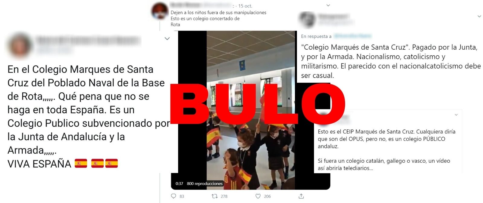 Circula en Twitter un vídeo de un grupo de niños con mascarillas, formando filas y ondeando banderas de España mientras suena el himno nacional. Las imágenes se comparten con comentarios que lo sitúan en el Colegio Público Marqués de Santa Cruz, en Rota (Cádiz). Es un bulo. No es en un colegio público ni es en Rota. Se trata de un homenaje a la bandera en el colegio privado Everest School en Pozuelo de Alarcón (Madrid), como nos han afirmado desde el propio centro.