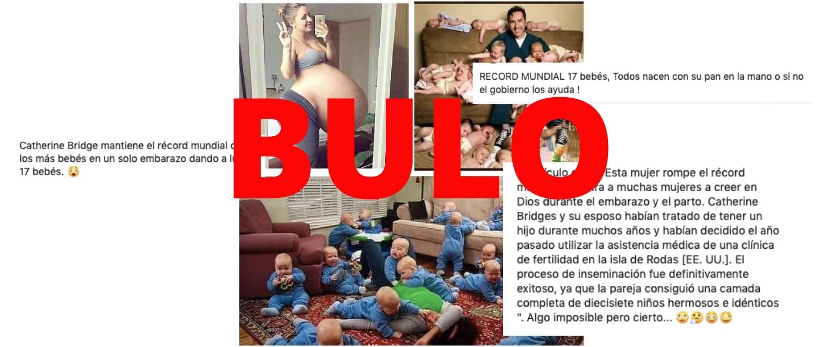 Volvéis a preguntarnos por una composición de tres imágenes en las que se ve a una mujer embarazada en una y dos fotos en las que salen muchos bebés. Estas imágenes se difunden con mensajes como "Catherine Bridge mantiene el récord mundial de los más bebés en un solo embarazo dando a luz a 17 bebés". Es un bulo: sale de la web Worlds News Daily Report que avisa de que todo su contenido es ficticio, la imagen de la mujer embarazada está manipulada y el récord mundial en un embarazo está en 8 bebés.
