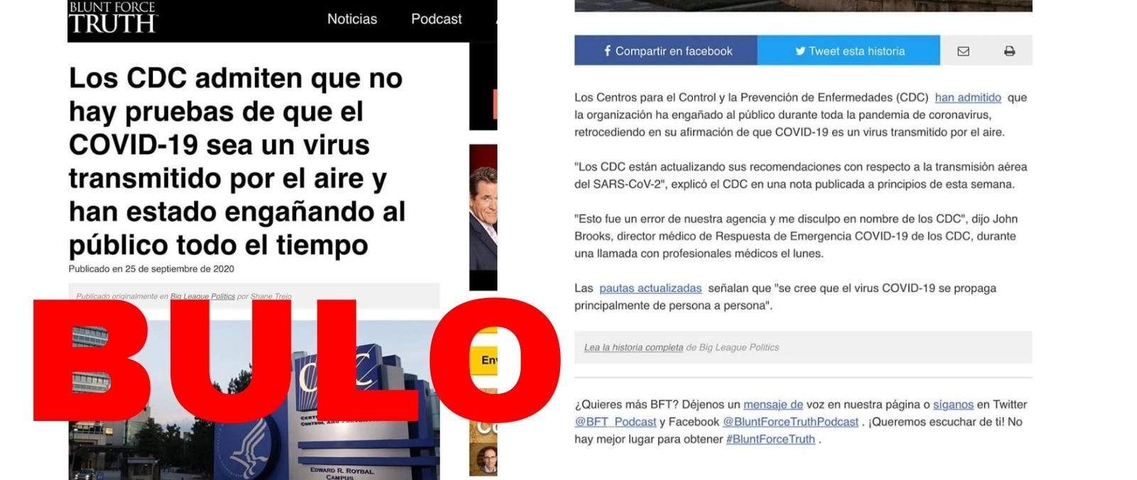 Circula en redes sociales un contenido que afirma que los CDC (los Centros para el Control y Prevención de Enfermedades de Estados Unidos) "admiten que no hay pruebas de que el COVID-19 sea un virus transmitido por el aire y han estado engañado al público todo el tiempo". Pero es un bulo.