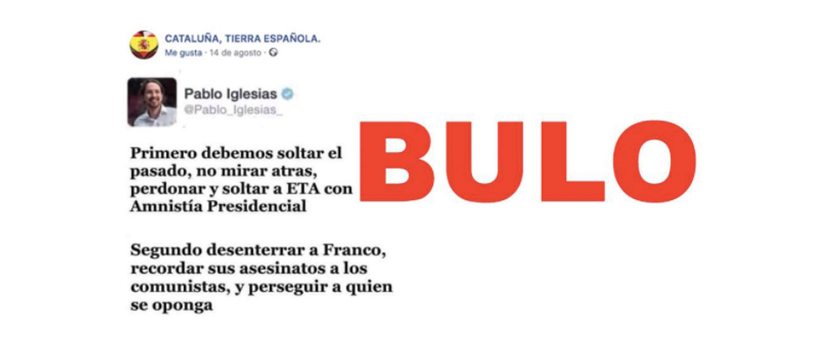 *Esta pieza ha sido modificada y ha pasado de ser Desinformación sin pruebas a Bulo el 20/10/2020 de acuerdo con la actualización de nuestra metodología. El titular actual ha pasado de "No, no hay pruebas de que Pablo Iglesias haya publicado este tuit pidiendo una amnistía para ETA y perseguir a quien se oponga a desenterrar a Franco" a "No, Pablo Iglesias no ha publicado este tuit pidiendo una amnistía para ETA y perseguir a quien se oponga a desenterrar a Franco".