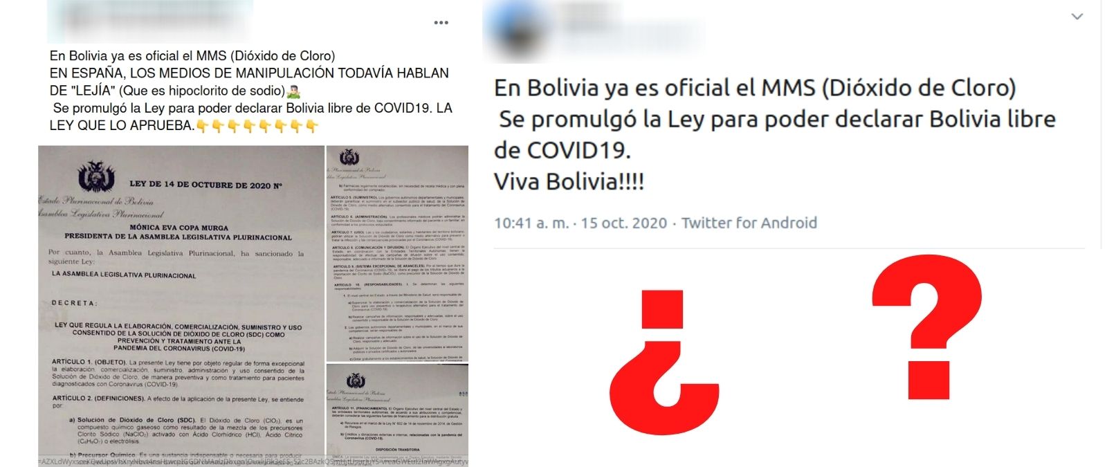 Se ha viralizado en redes sociales mensajes que afirman que "En Bolivia ya es oficial el MMS (Dióxido de Cloro)" en base a una "Ley para poder declarar Bolivia libre de COVID19. LA LEY QUE LO APRUEBA". Pero el Ministerio de Salud mantiene la prohibición del dióxido de cloro en toda Bolivia aunque la Asamblea Legislativa Plurinacional haya aprobado la "Ley que regula la elaboración, comercialización, suministro y uso consentido de la solución del dióxido de cloro (SDC) para la prevención y tratamiento ante la pandemia del coronavirus (COVID-19)". Además, no hay evidencias científicas de la eficacia del dióxido de cloro en el tratamiento de la COVID-19 y su consumo puede ser peligroso.