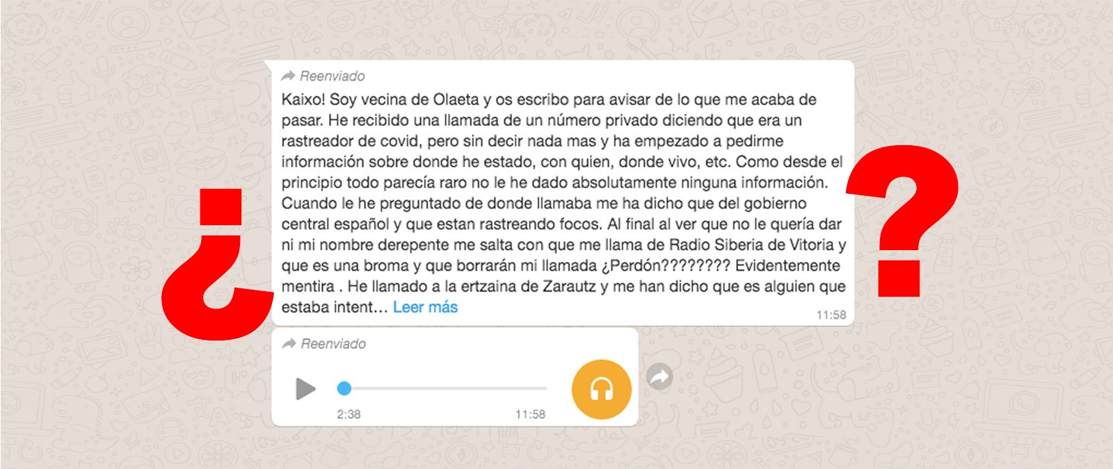 Nos habéis mandado a nuestro chatbot de WhatsApp (+34 644 22 93 19) un audio el que una persona cuenta que ha recibido una llamada en número oculto de un supuesto rastreador de COVID-19 del Gobierno "central" que le preguntaba cosas personales. "De repente me ha saltado con que me llamaba de Radio Siberia de Vitoria (...) que era una broma", explica la persona del audio. Además, asegura que la Ertzaintza le ha dicho que "son gente que están intentando sacar datos para luego robar". También ha circulado una cadena de WhatsApp de una "vecina de Olaeta" que cuenta lo mismo y que dice que contactó con la Ertzaintza de Zarautz.