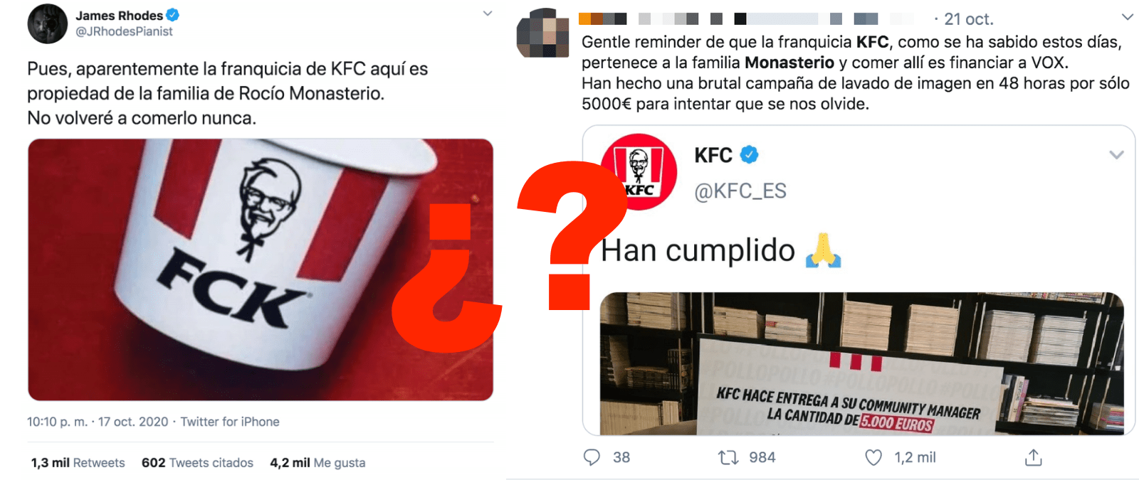 Este contenido fue también tuiteado recientemente por el pianista James Rhodes, quien dijo en su perfil de Twitter que “aparentemente la franquicia de KFC aquí es propiedad de Rocío Monasterio” y que se ha hecho viral.