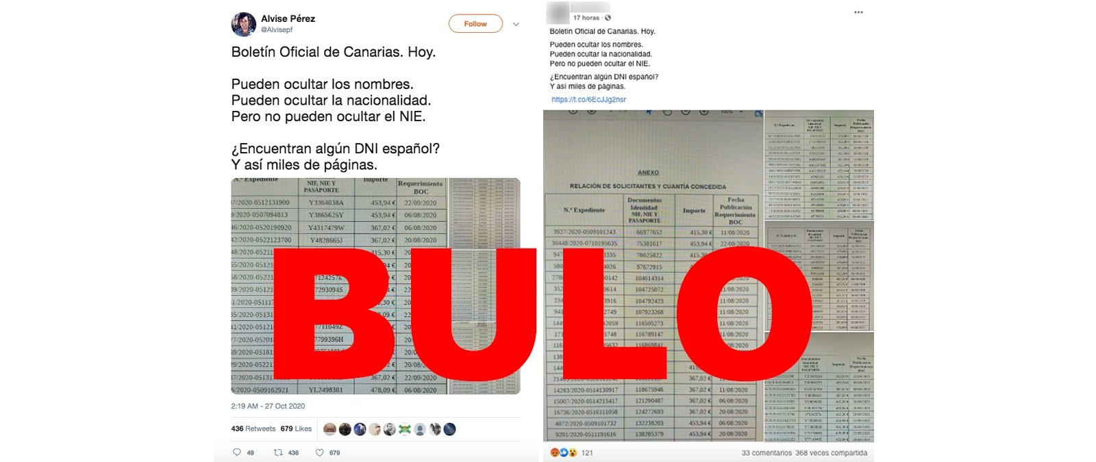 Se han difundido imágenes de un listado de personas a las que se les ha concedido el Ingreso Canario de Emergencia. En el documento, las personas están identificadas con números que corresponden a un Número de Identificación de Extranjeros (NIE) o a un pasaporte. Las fotos se comparten este mensaje: "Pueden ocultar los nombres. Pueden ocultar la nacionalidad. Pero no pueden ocultar el NIE. ¿Encuentran algún DNI español? Y así miles de páginas". Pero es un bulo que esta ayuda sólo se haya concedido a personas extranjeras con NIE o con pasaporte.