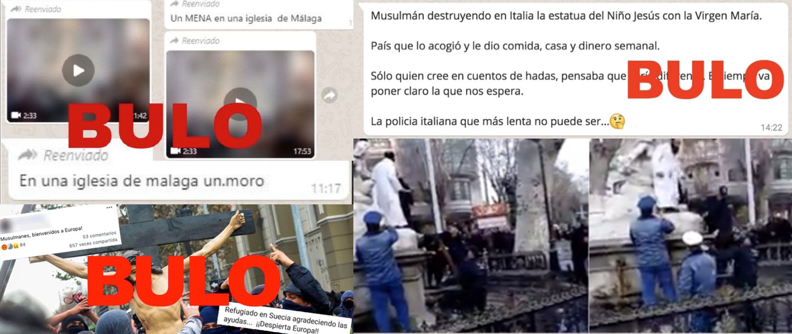 Ataques a estatuas o imágenes de Cristo, incendios supuestamente provocados en iglesias o acciones vandálicas durante una misa. Los desinformadores utilizan supuestas agresiones a símbolos católicos para desinformar contra los musulmanes afirmando que han sucedido en diferentes lugares de España o Europa con mensajes que, además, les señalan como extranjeros. Estos bulos se difunden con afirmaciones como “musulmán destruyendo en Italia la estatua del Niño Jesús” seguido de “país que lo acogió” o “mena en una Iglesia de Málaga” para referirse a un vídeo de un hombre desnudo en una capilla. Sin embargo, estos vídeos y fotos están descontextualizados y ninguno muestra a musulmanes acogidos rompiendo simbología cristiana en Europa.