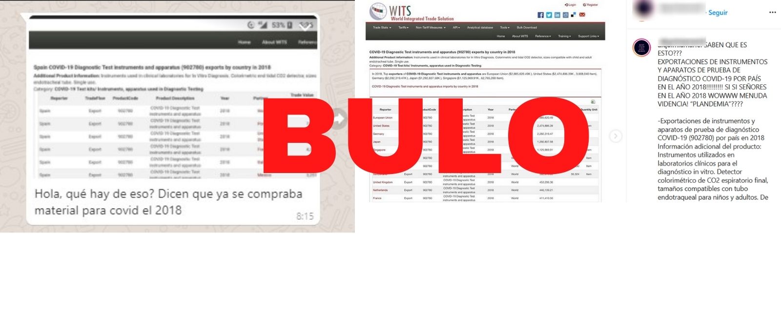 El Banco Mundial, nuevo foco de la desinformación sobre la COVID-19. Se ha viralizado una tabla titulada 'Exportaciones de instrumentos y aparatos de prueba de diagnóstico COVID-19 (902780) por país en 2018' procedente de una base de datos de la web del Banco Mundial como prueba de que se compraba material contra la COVID-19 en 2018, antes de la aparición del coronavirus a finales de 2019. También circula como vídeo *. Es un bulo.