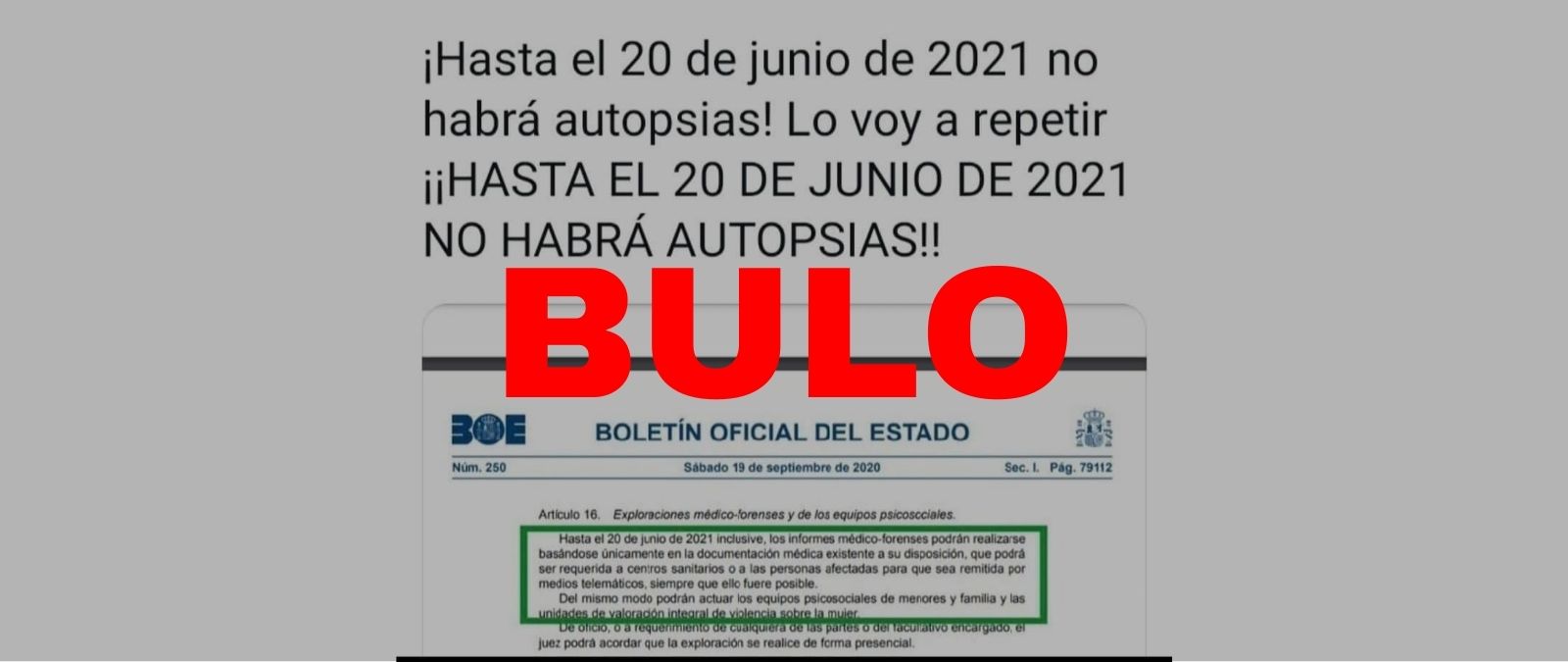 Así, es falso que no se puedan realizar autopsias hasta el 20 de junio de 2021, puesto que la Ley 3/2020 de 18 de septiembre no las prohíbe.