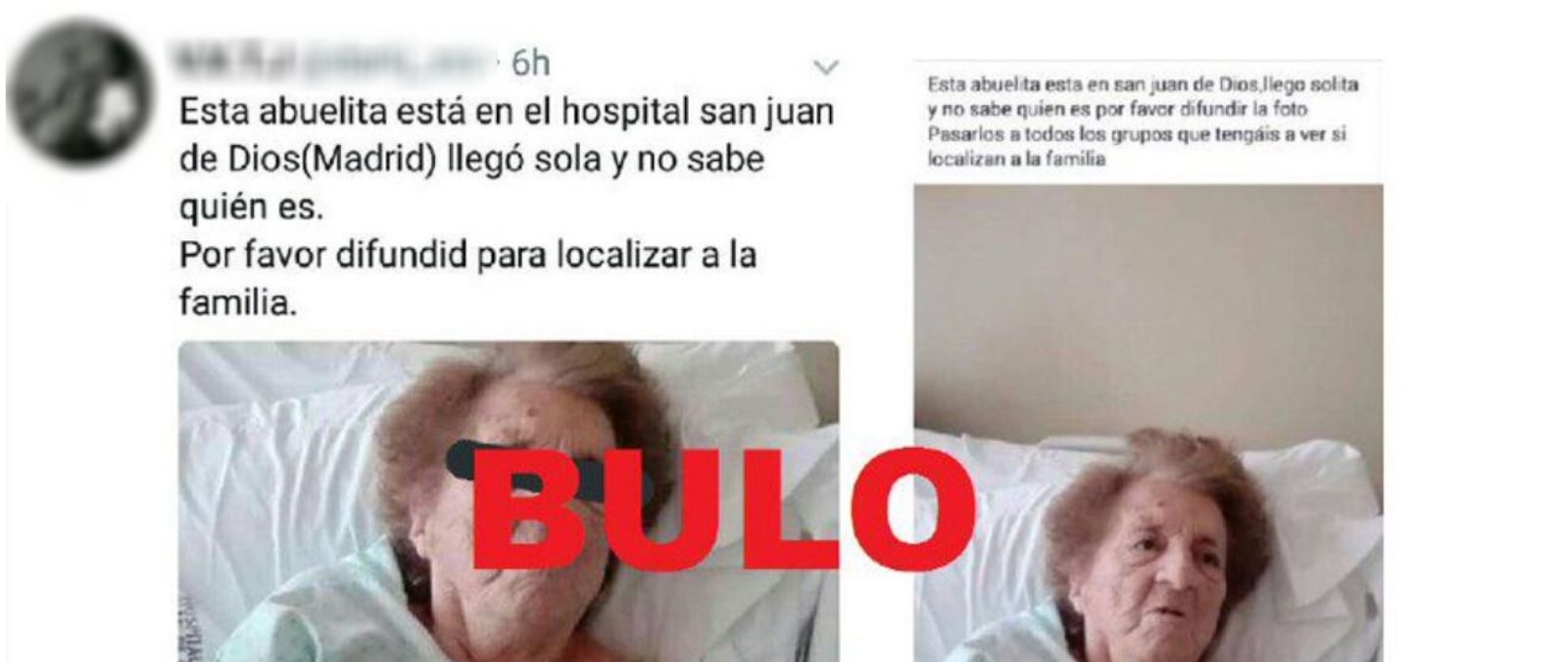 Vuelve a circular una cadena que asegura que hay una "abuelita" sola en el Hospital San Juan de Dios que no sabe quién es. Es un bulo que circula desde hace años y que ya desmentimos en 2017.
