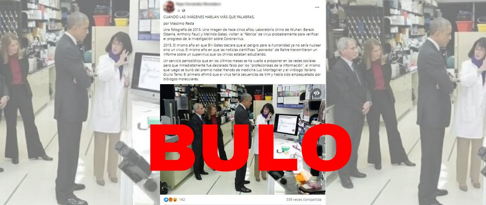 Está circulando una fotografía del expresidente de Estados Unidos, Barack Obama, con un texto que dice que es en un "laboratorio chino de Wuhan. Barack Obama, Anthony Fauci y Melinda Gates, visitan la "fábrica" de virus probablemente para verificar el progreso de la investigación sobre Coronavirus". Pero es un bulo. La imagen fue tomada en 2014 en el Instituto Nacional de Alergia y Enfermedades Infecciosas ubicado en Maryland (Estados Unidos). Además, en ella no aparece Melinda Gates.