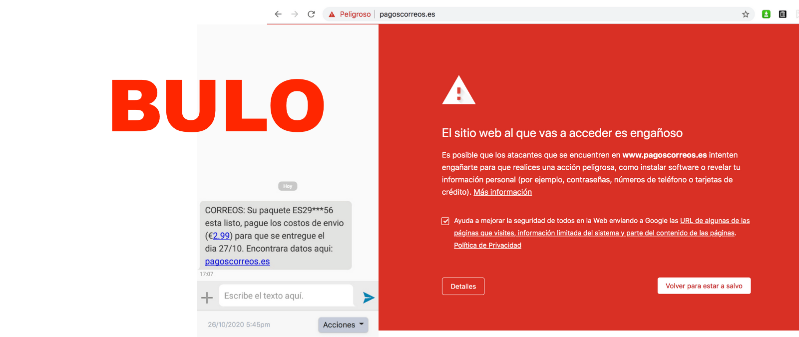 Además, la web a la que te redirige el enlace del SMS (http://www.pagoscorreos.es/) no es la página oficial de Correos (http://www.correos.es) y, si intentas acceder el navegador te advierte de que “ha detectado phishing” debido a que intentan suplantar la identidad de otra web para engañarte. También indican que es posible que te intenten instalar software o revelar tu información personal como contraseñas, números de teléfono o tarjetas de crédito. Como decimos, la página no es de Correos.