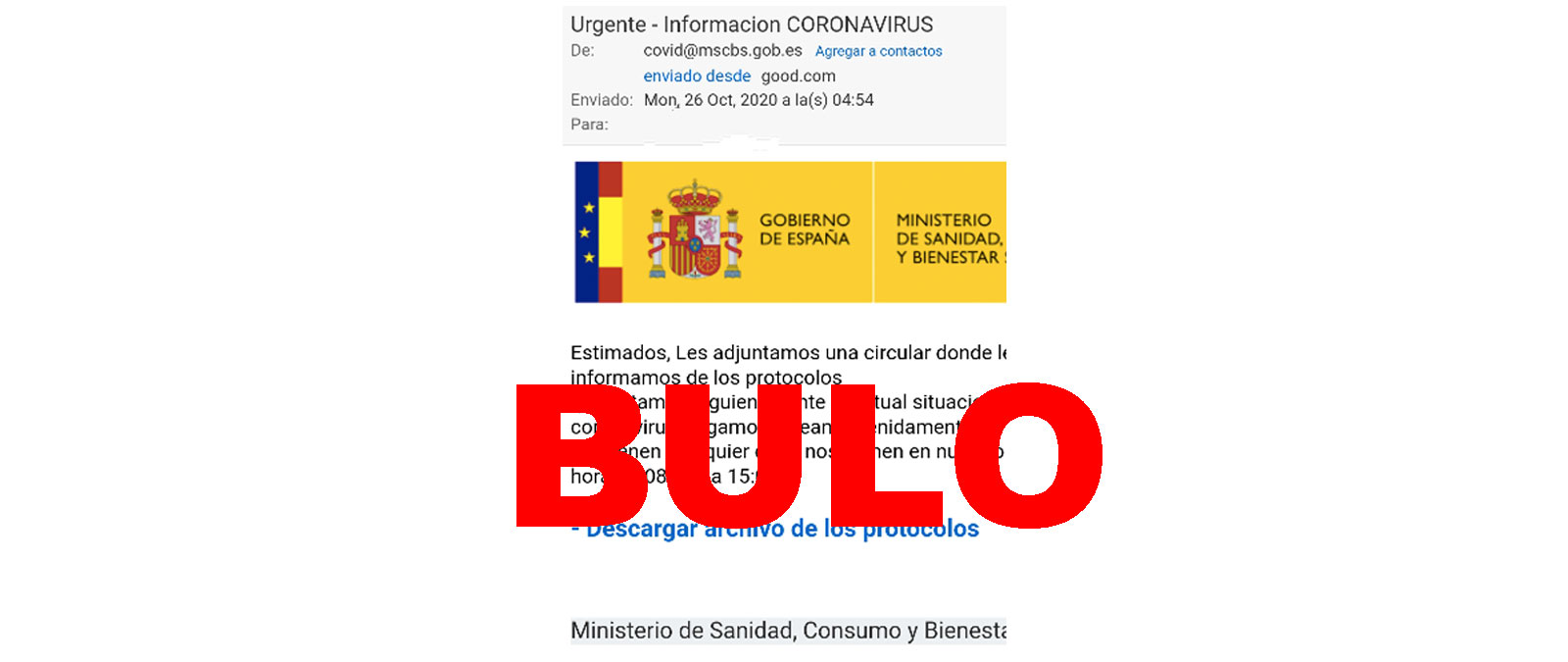 Mucho cuidado si recibes un supuesto correo electrónico del Ministerio de Sanidad en el que se adjunta un "protocolo" contra la COVID-19, porque se trata de una campaña de malware que busca descargar un archivo malicioso en nuestro equipo, tal y como nos aseguran desde el Instituto Nacional de Ciberseguridad (INCIBE). Sanidad también ha confirmado a Maldita.es que no es un correo oficial del Ministerio y que la dirección desde la que se envía ([email protected]) no es suya.