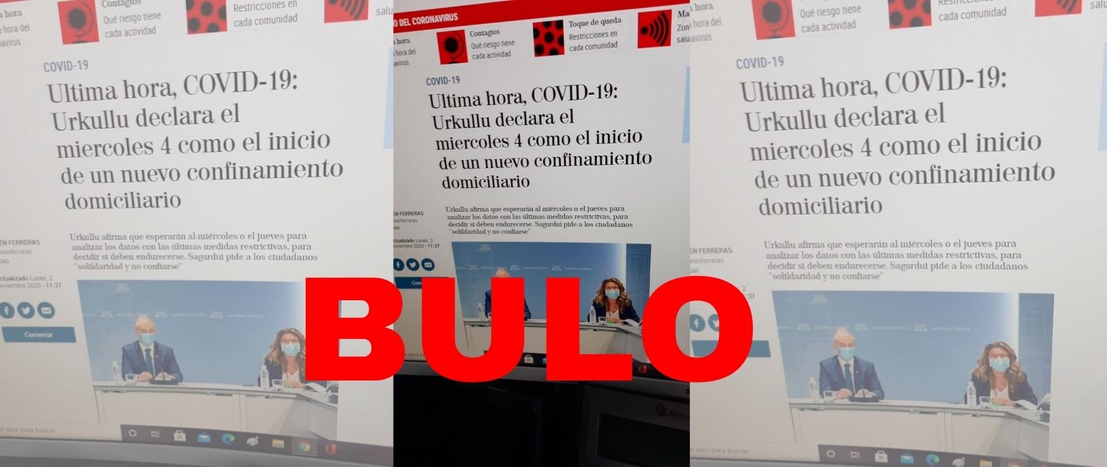 Está circulando un contenido que asegura que Íñigo Urkullu, el lehendakari del Gobierno vasco, ha declarado un confinamiento domiciliario a partir del miércoles 4 de noviembre debido a la segunda ola de la pandemia por coronavirus. Es un bulo. La imagen que circula como si fuese el titular de un medio de comunicación es una captura manipulada de una información de El Mundo. Además, a fecha de 3 de noviembre a las 13:04 horas no hay ninguna publicación que recoja este supuesto confinamiento y tanto la cadena pública EiTB como la Asociación de Voluntarios Digitales de Emergencias de Euskadi (VOSTEuskadi) aseguran que es falso.