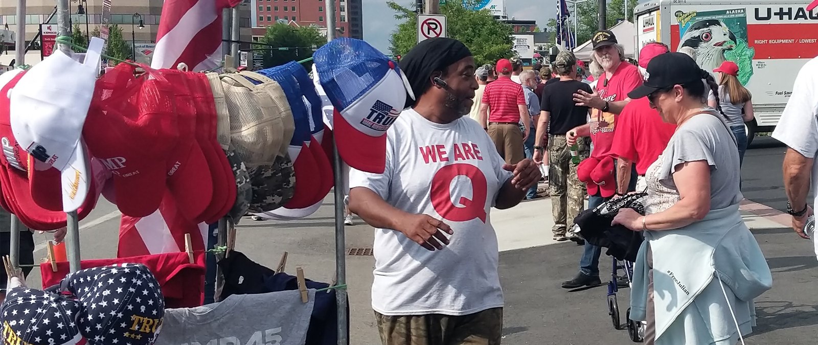 QAnon se ha filtrado en el mundo real, fuera de las redes sociales. En 2017, en un mitin de Donald Trump en Tampa, Florida, muchos asistentes llevaron camisetas y pancartas con la letra "Q". Según indicó la BBC, "esta fue la primera vez que los seguidores de esta teoría se manifestaban en público".