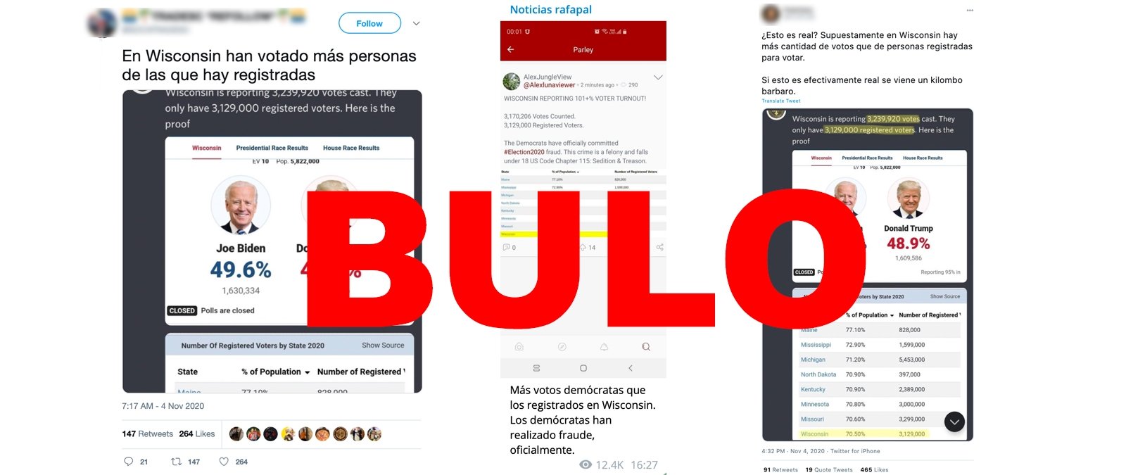 Nos habéis preguntado por varios mensajes que circulan en redes sociales y que afirman que “en Wisconsin han votado más personas de las que hay registradas”, que en este estado “hay más cantidad de votos que de personas registradas para votar”, o que “los demócratas han realizado [un] fraude, oficialmente”, afirmando que se trata de un "pucherazo evidente" (como se puede leer aquí, aquí o aquí). Es un bulo: en Wisconsin hay registradas como votantes 3.684.726 personas, según los datos oficiales publicados por la Comisión Electoral de Wisconsin, y se han contabilizado un total de 3.278.757 votos, de media. Una media calculada a partir de los resultados publicados por cuatro medios de comunicación estadounidenses a 4 de noviembre a las 17 horas.