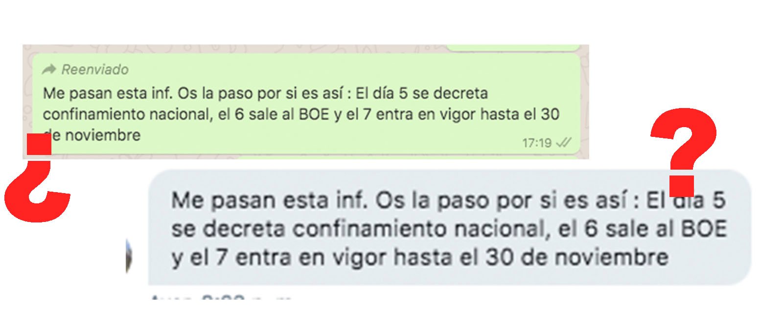 Además, el 4 de noviembre el Ministerio de Sanidad ha asegurado que también es falso un mensaje parecido que dice lo siguiente: "Chicos todavía no es oficial pero de buena fuente nos van a confinar del 8 de noviembre al 8 de diciembre. Pueden moverse los servicios básicos. Creen que no va a ser cómo en marzo, pero habrá confinamiento domiciliario". *