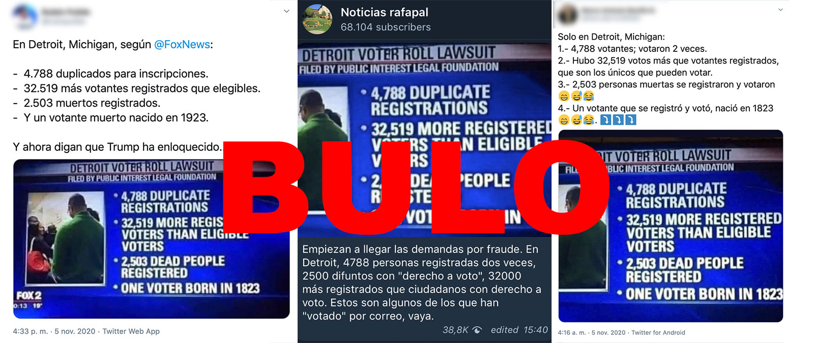 Se ha difundido en redes sociales una captura de una televisión local de Fox News en Detroit (Michigan) en la que hablan de que "4.788 electores votaron dos veces", "hubo 32.519 votos más que votantes registrados", "2.503 muertos registrados" y "un votante muerto nacido en 1823". Es un bulo, la imagen es de diciembre de 2019, de una denuncia interpuesta contra funcionarios electorales de Detroit alegando que "no mantuvieron las listas de votantes precisas y actualizadas", tal y como ha explicado la propia cadena.