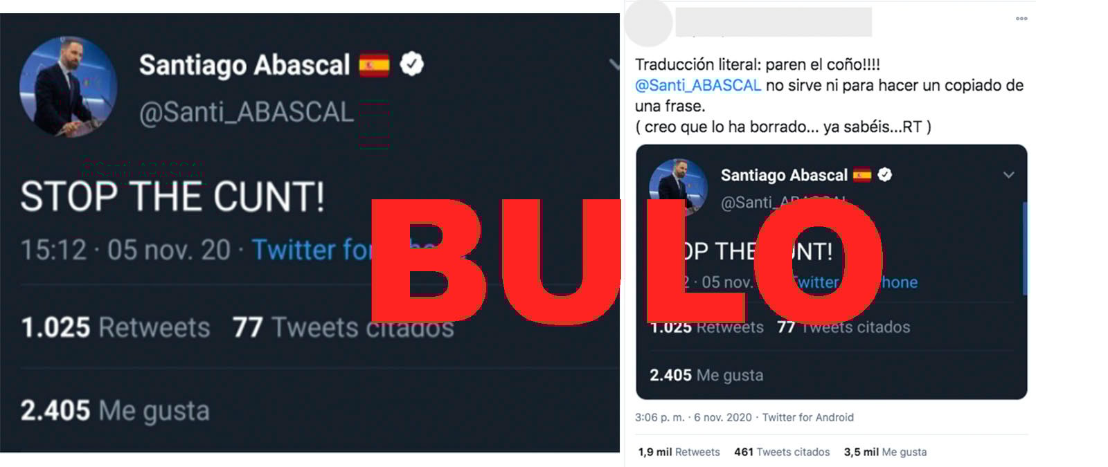 ¿Ha tuiteado Santiago Abascal "STOP THE CUNT!" (paren el coño o paren al gilipollas) tras las elecciones presidenciales de Estados Unidos? Nos habéis preguntado a través de nuestro servicio de WhatsApp (+34 644 229 319) por una imagen de ese supuesto tuit que haría referencia al "STOP THE COUNT!" (paren el recuento) tuiteado por Donald Trump. Pero es un bulo. Se comparte siempre una misma captura, con el mismo número de retuits y de "me gusta" y el supuesto tuit no aparece en la cuenta del líder de Vox ni tampoco archivado. Además, desde prensa de Vox afirman que "jamás tuiteó eso".