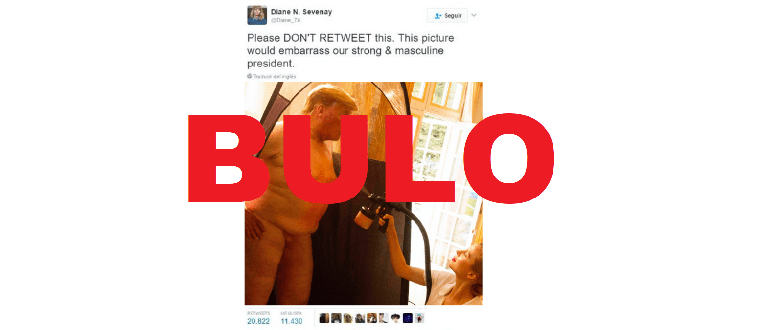 Está circulando una supuesta imagen del presidente de los Estados Unidos, Donald Trump, en la que aparece desnudo y una mujer le está rociando con un spray bronceador. Es un bulo que ya desmentimos en 2017 y que ahora vuelve a difundirse: la imagen que se está compartiendo no es real. Es una de las imágenes de la artista británica Alison Jackson, incluidas en su libro 'Private', en las que se imaginó cómo sería el primer día de Donald Trump en la Casa Blanca.