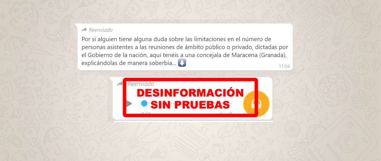 Nos habéis hecho llegar a nuestro chatbot de WhatsApp (+34 644 229 319) un audio en el que una mujer, que dice que habla desde Maracena (Granada), intenta explicar cuál es el número máximo de personas que se pueden reunir en el ámbito privado según las medidas adoptadas para frenar la segunda ola de la pandemia de coronavirus. Llega, además, con un mensaje que asegura que se trata de una concejala del Ayuntamiento de Maracena. Pero no hay pruebas de que sea una concejala. Desde el Ayuntamiento de Maracena lo niegan. Además, la explicación que da sobre las medidas no es correcta.