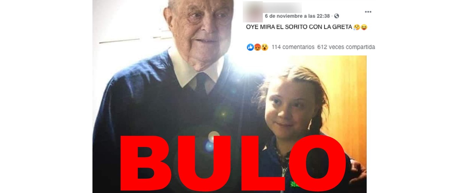Vuele a moverse en redes una supuesta fotografía en la que salen el inversor George Soros y la activista por el clima Greta Thunberg. Es un bulo que ya desmentimos en 2019. Se trata de un montaje, se ha pegado la cara de George Soros encima de la del ex vicepresidente estadounidense y activista climático Al Gore.