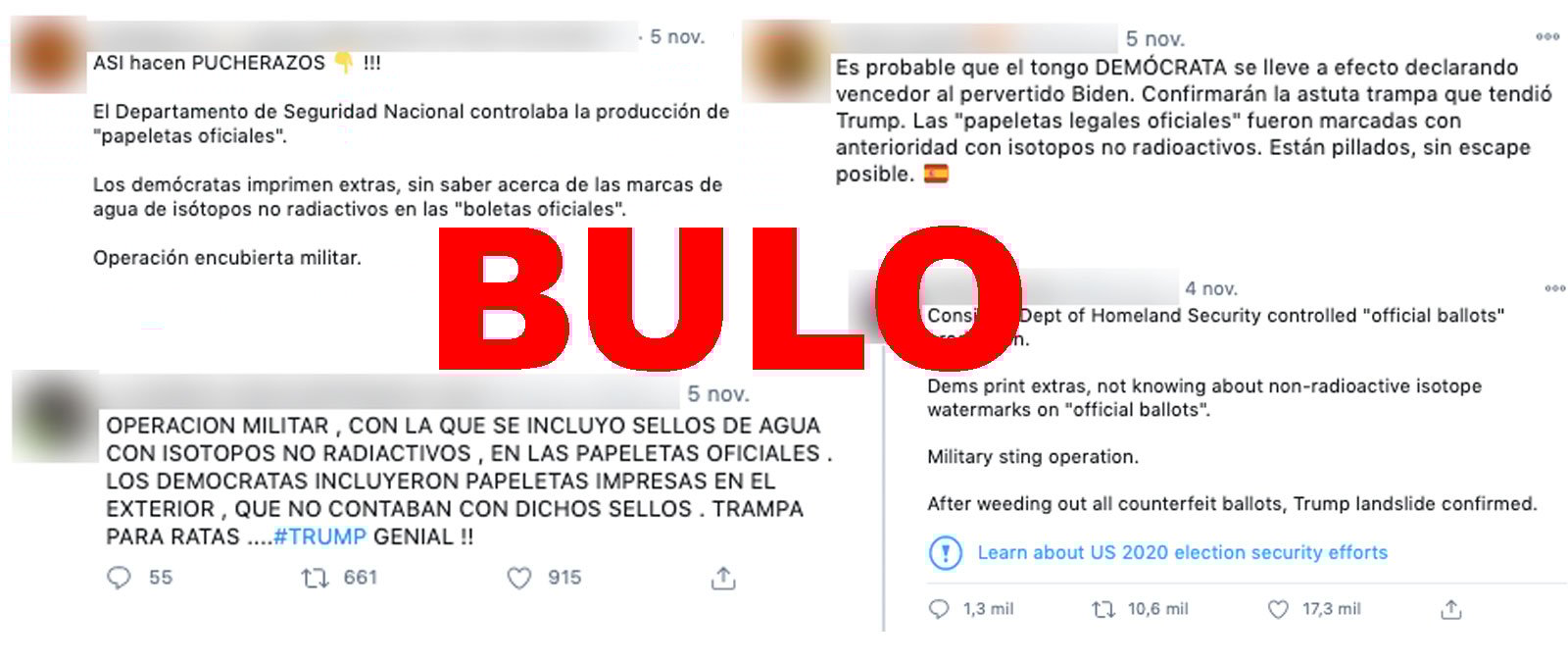 Por lo tanto, es un bulo que el Departamento de Seguridad Nacional haya demostrado fraude electoral de los demócratas a través de una "operación militar" en la que pusieron una "marca de agua de isótopos no radioactivos en las papeletas oficiales". Se trata de una desinformación que otros medios de verificación como Politifact, Snopes o las secciones de fact-checking de Reuters o USA Today ya han desmentido.
