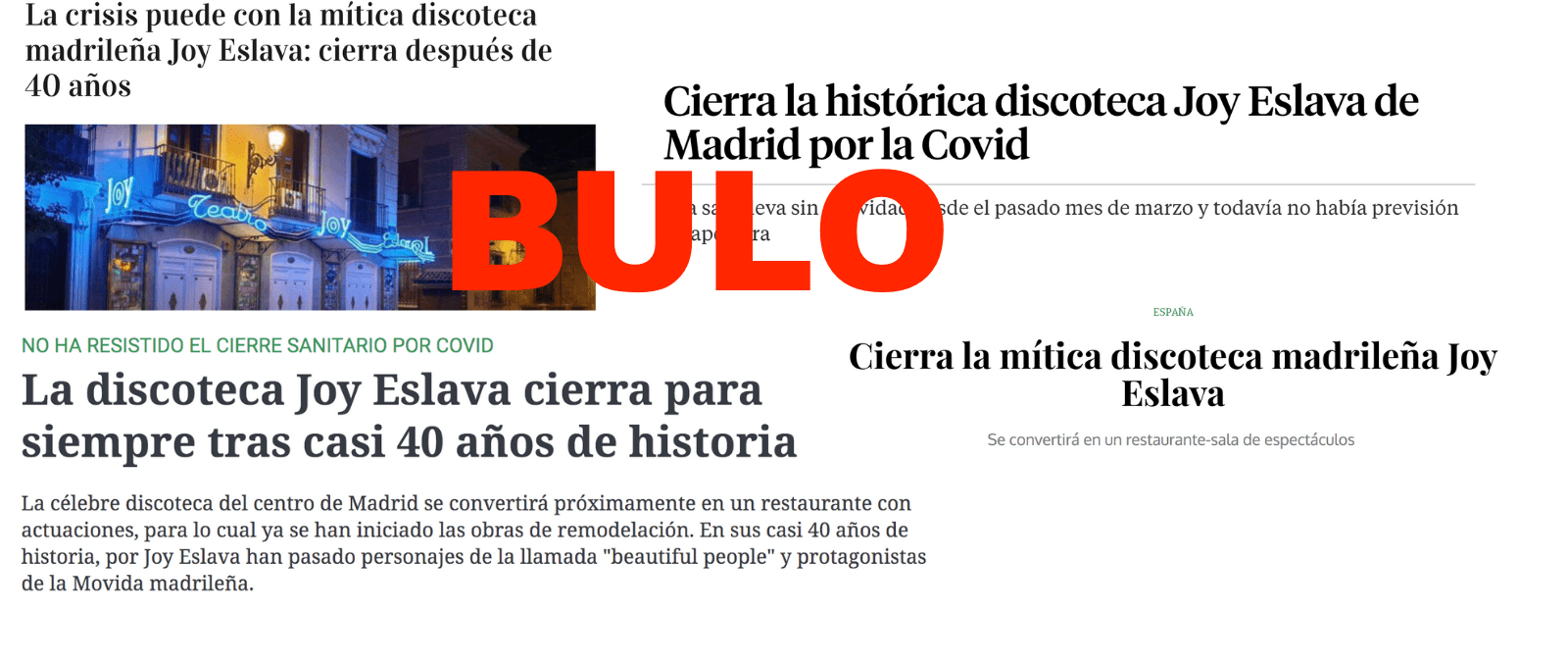 El pasado miércoles 11 de noviembre diversos medios de comunicación anunciaron que la sala madrileña Joy Eslava cerraba sus puertas "para siempre" tras haber permanecido inactiva desde el inicio de la pandemia. Pero es un bulo. Joy Eslava ha emitido un comunicado en el que declara que la discoteca está siendo remodelada y que volverá a abrir cuando las circunstancias lo permitan.