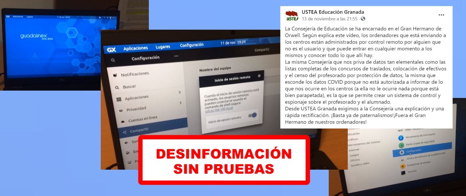 Está circulando en redes sociales un vídeo en el que una persona dice que el nuevo sistema operativo instalado en los ordenadores portátiles comprados por la Junta de Andalucía para el profesorado y el alumnado tiene "un problema de control por el administrador, que no es el usuario que maneja el ordenador", y por el cual otra persona podría ver en cualquier momento todo lo que se hace en esos ordenadores. El mismo vídeo también lo ha compartido en Facebook un sindicato que dice que de esta forma "se permite crear un sistema de control y espionaje sobre el profesorado y el alumnado" por parte de la Junta. Pero no hay pruebas de que la Junta esté usando estos ordenadores para "el espionaje".