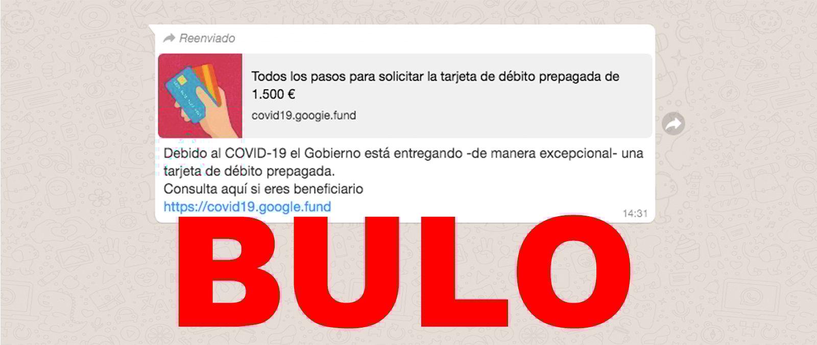 Nos habéis preguntado a través de nuestro chatbot de WhatsApp (+34 644 229 319) por una cadena que dice que "debido al COVID-19 el Gobierno está entregando -de manera excepcional- una tarjeta de débito prepagada" y adjunta un enlace para consultar supuestamente si eres beneficiario o no de la tarjeta. Cuidado porque es un bulo, se trata de un caso de phishing, una técnica que utilizan timadores para intentar hacerse con tus datos personales.