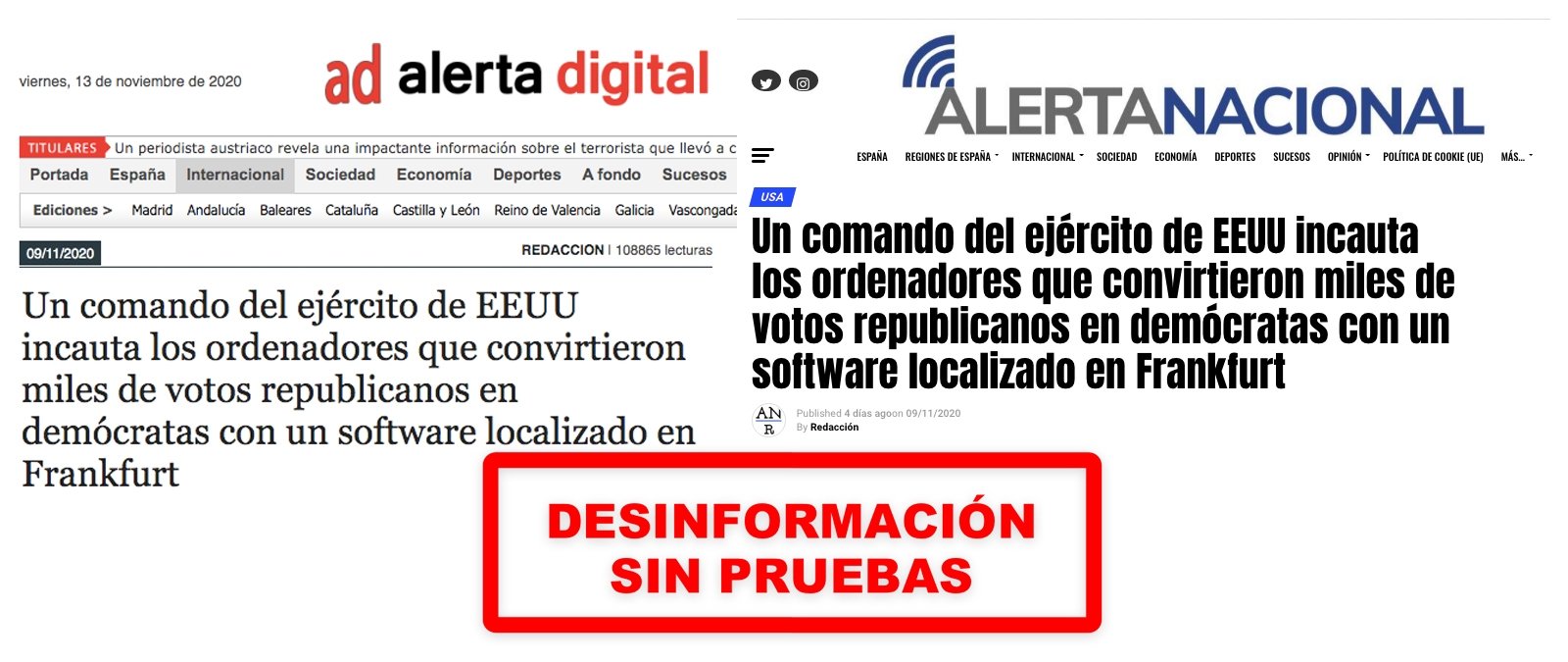 Nos habéis preguntado a través de nuestro chatbot de WhatsApp (+34 644 229 319) por un contenido publicado por Alerta Digital y Alerta Nacional con un titular que afirma: "Un comando del ejército de EEUU incauta los ordenadores que convirtieron miles de votos republicanos en demócratas con un software localizado en Frankfurt". Ya en el cuerpo del texto, se dice que el software ha sido localizado mediante la dirección IP, concretamente "en las oficinas de un proveedor español de sistemas de votación electrónica y tecnología electoral". Es una desinformación sin pruebas.