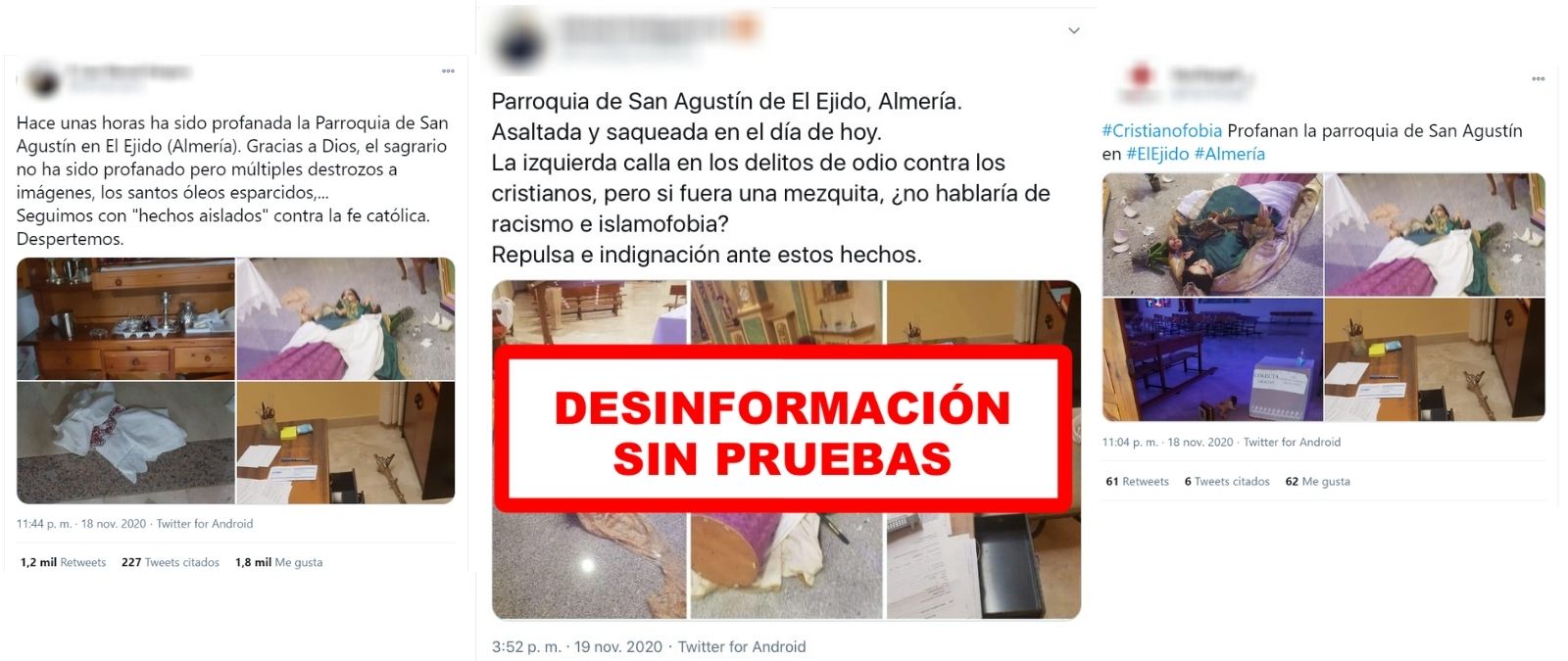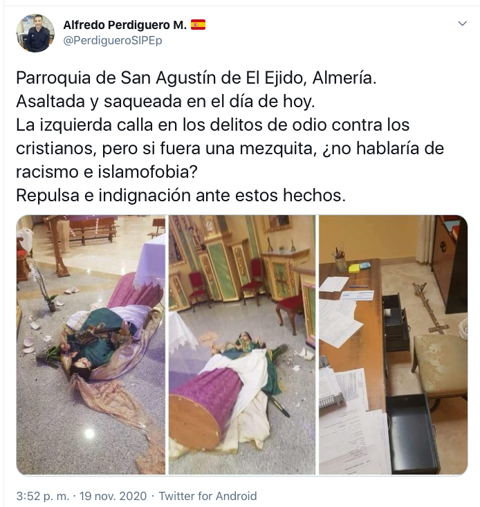 La mañana del miércoles 18 de noviembre, la parroquia de San Agustín en El Ejido amaneció con algunos destrozos en sus imágenes religiosas y con la ausencia de algunos objetos, por lo que la Guardia Civil inició una investigación, tal y como informaba Europa Press. Tras lo sucedido, algunos usuarios compartieron fotografías del interior de la parroquia afirmando que "la izquierda calla en los delitos de odio contra los cristianos, pero si fuera una mezquita, ¿no hablaría de racismo e islamofobia?" o calificando los hechos de "cristianofobia".