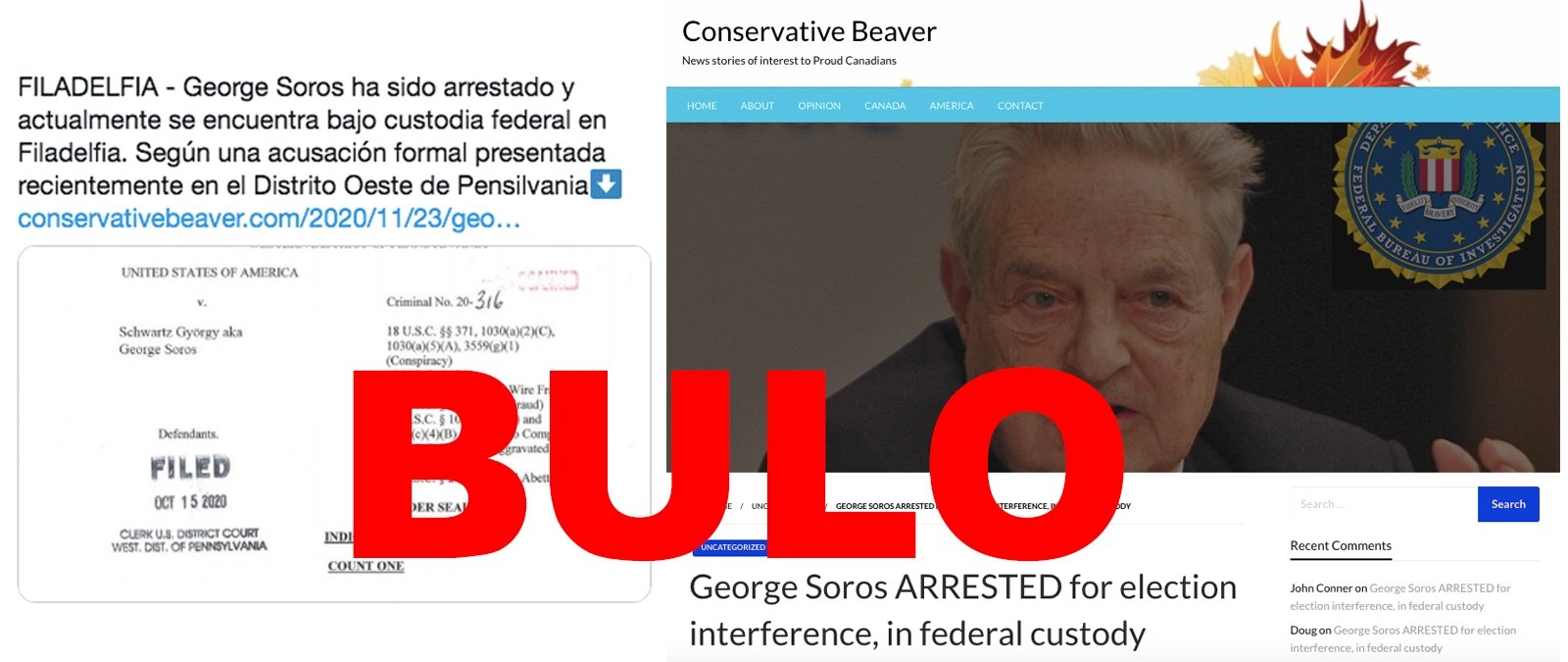 Por lo tanto, es un bulo que George Soros haya sido arrestado por "interferencia electoral". En Maldita.es estamos recopilando todas las desinformaciones y los bulos que hemos verificado sobre el recuento de las elecciones de Estados Unidos.