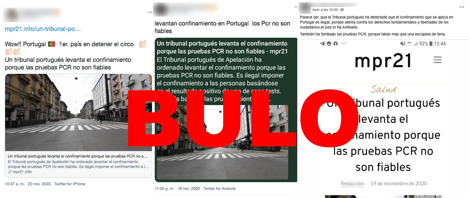 Según la web mpr21, "el Tribunal portugués de Apelación ha ordenado levantar el confinamiento porque las pruebas PCR no son fiables". Además, se mueve una cadena de WhatsApp que afirma que el tribunal ha declarado los test PCR como ilegales.