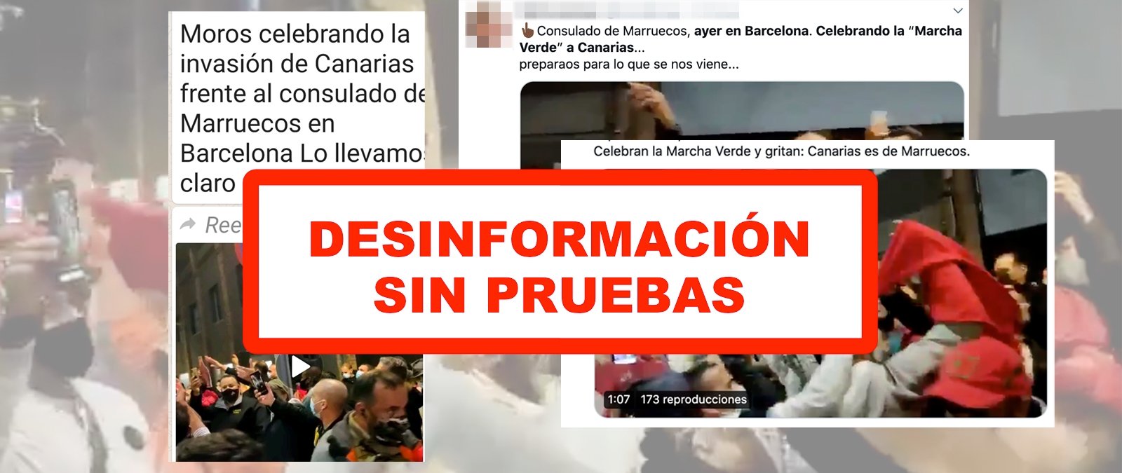 Lo que se ve en el vídeo sí es una manifestación enfrente del Consulado de Marruecos en Barcelona, pero no hay pruebas de que se esté celebrando una “marcha verde a Canarias” o de que se gritara “Canarias es de Marruecos”. Uno de los asistentes a la manifestación afirma que era por el aniversario de la independencia y en protesta por el intento de colocación de una bandera saharaui en el Consulado de Marruecos en Valencia tres días antes. Además, dos personas araboparlantes consultadas por Maldita.es afirman que no se menciona a Canarias ni a la inmigración en el vídeo ni en otro de 15 minutos de duración grabado durante la misma manifestación. Mossos d’Esquadra señalan que es una manifestación convocada que se produjo “sin incidentes”. Desde el Consulado de Marruecos en Barcelona no han respondido a las preguntas de Maldita.es sobre este asunto.